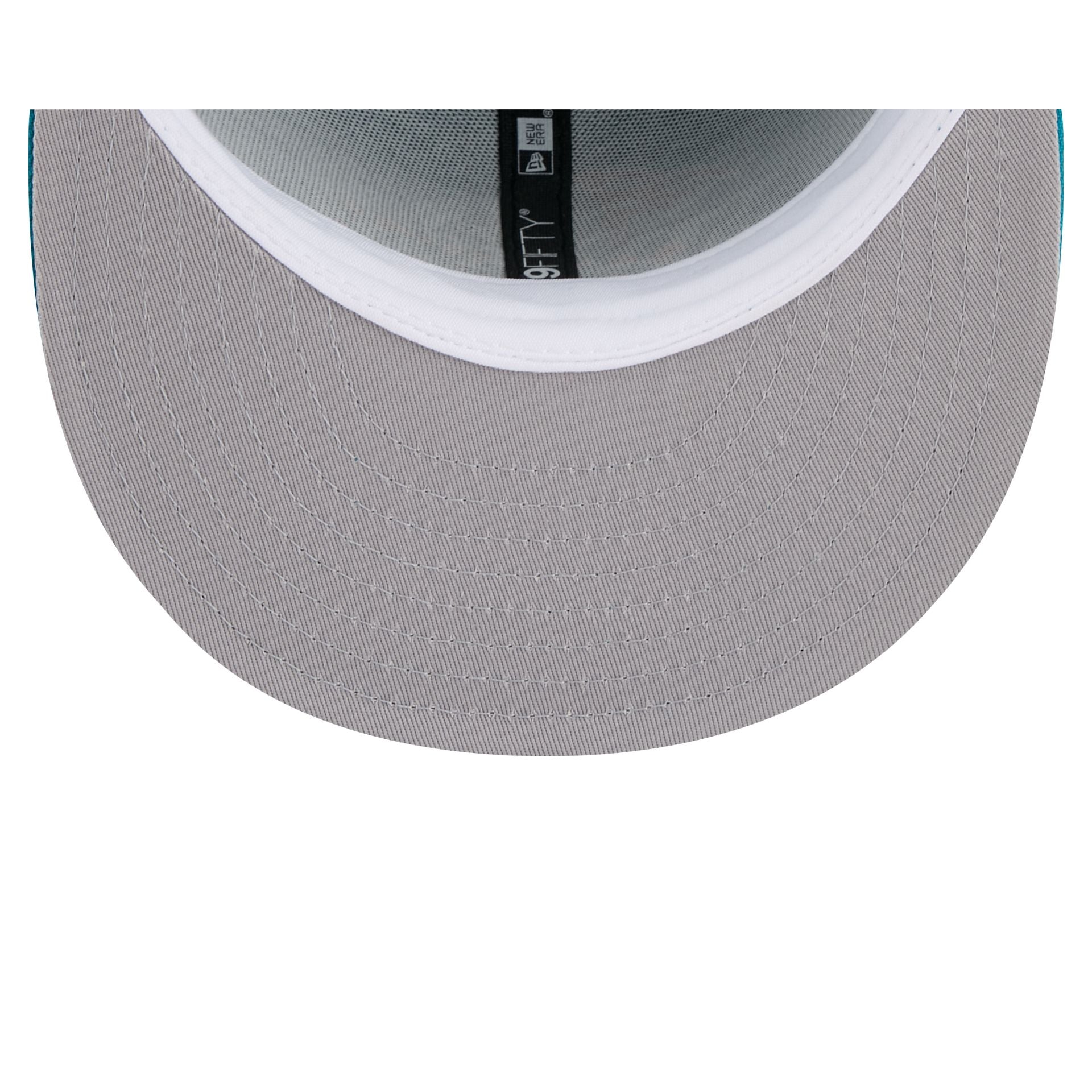 The Detroit Pistons 1996-2000 Hardwood Classics 9FIFTY Snapback features an embroidered vintage Pistons logo at the front panels with the NBA Logoman at the right-wear side. Additional details include an adjustable snapback closure at the rear and a gray undervisor.