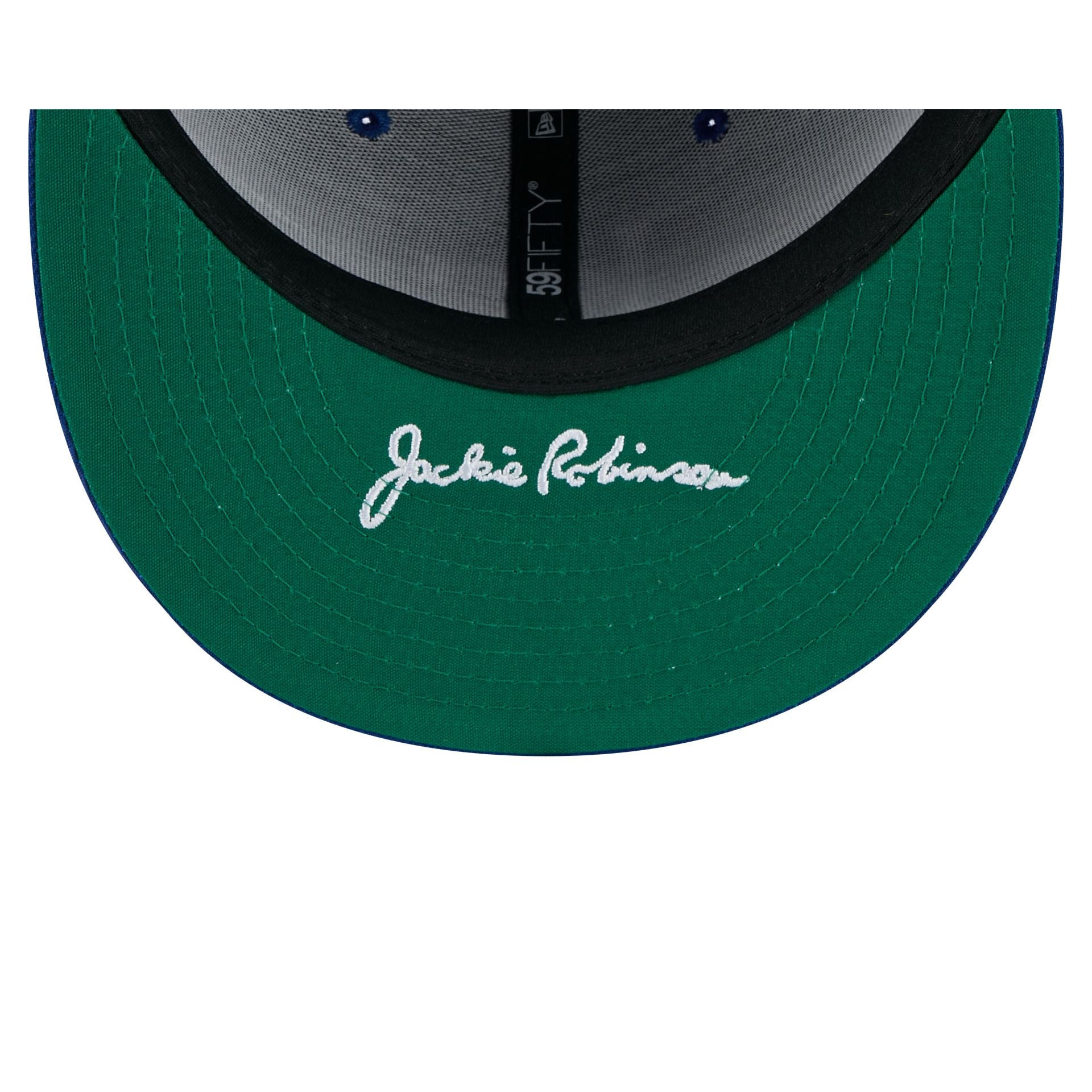The Kansas City Royals Jackie Robinson Day 2025 59FIFTY Fitted Cap features an embroidered Royals logo at the front panels with an MLB Batterman logo at the rear. Additional details include a Jackie Robinson Breaking Barriers patch at the right-wear side and Robinson’s embroidered signature on a green undervisor.