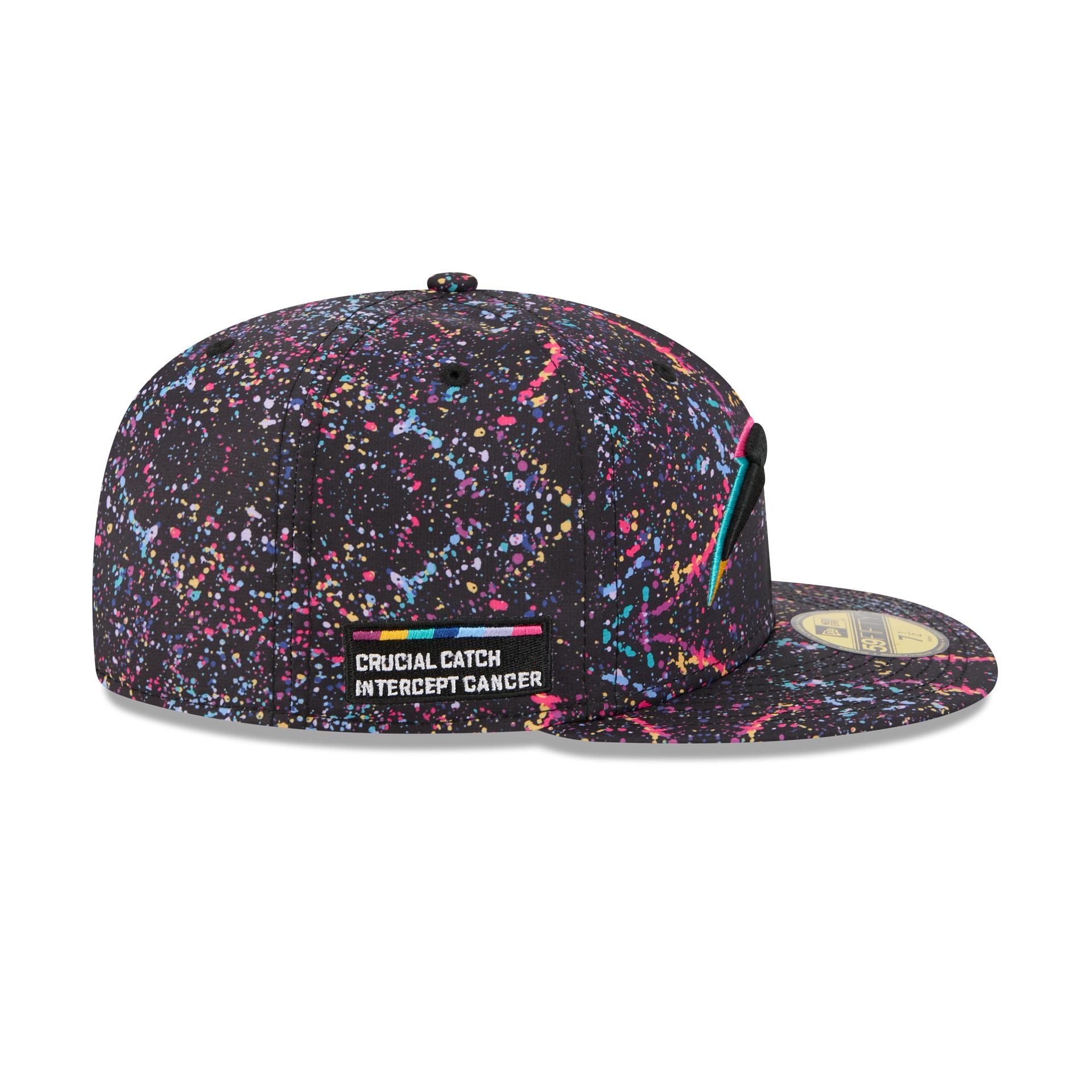 The Los Angeles Chargers 2025 Crucial Catch 59FIFTY Fitted Cap features an embroidered Chargers logo at the front paint splatter panels with an NFL Shield at the rear, a Crucial Catch Intercept Cancer patch at the right-wear side, and a black undervisor.
