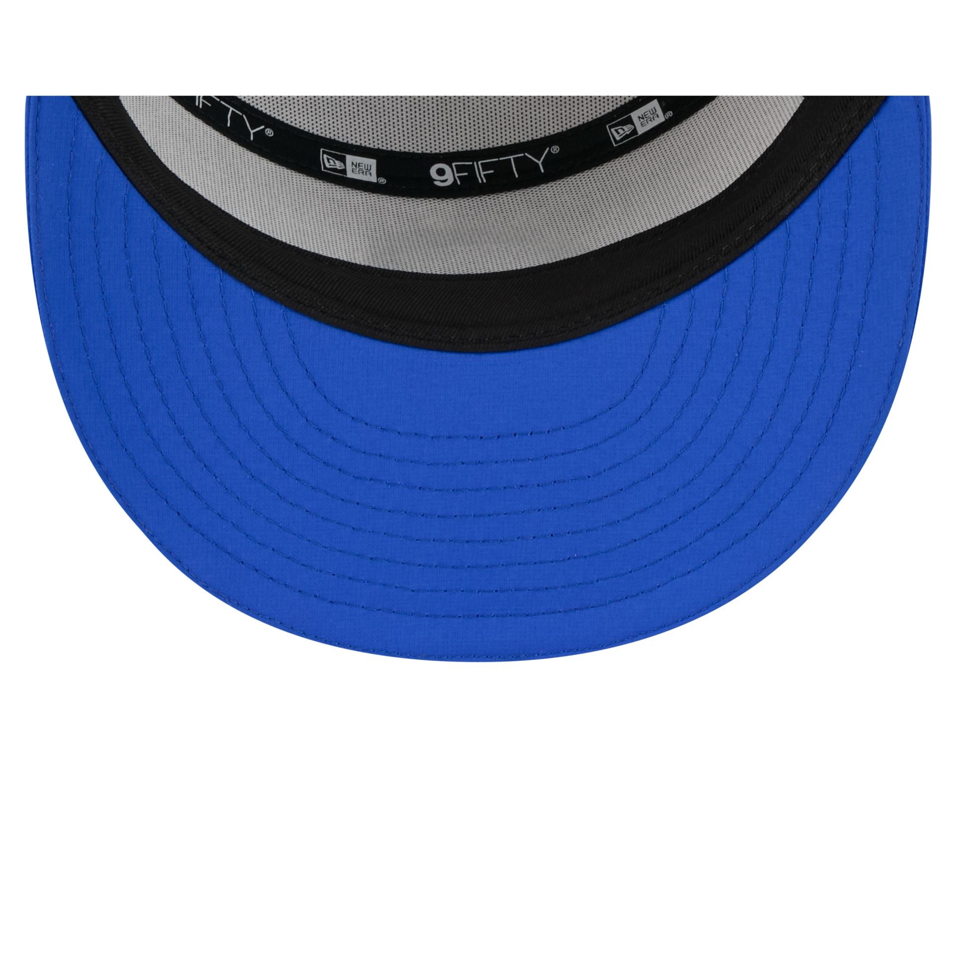 The Los Angeles Rams 2025 Training Split Panel 9FIFTY Snapback features a silicone Rams patch at the front panel with team color stripes at the front of a blue visor. Additional details include a silicone NFL Shield patch on a woven foldover tab above a snapback closure at the rear.