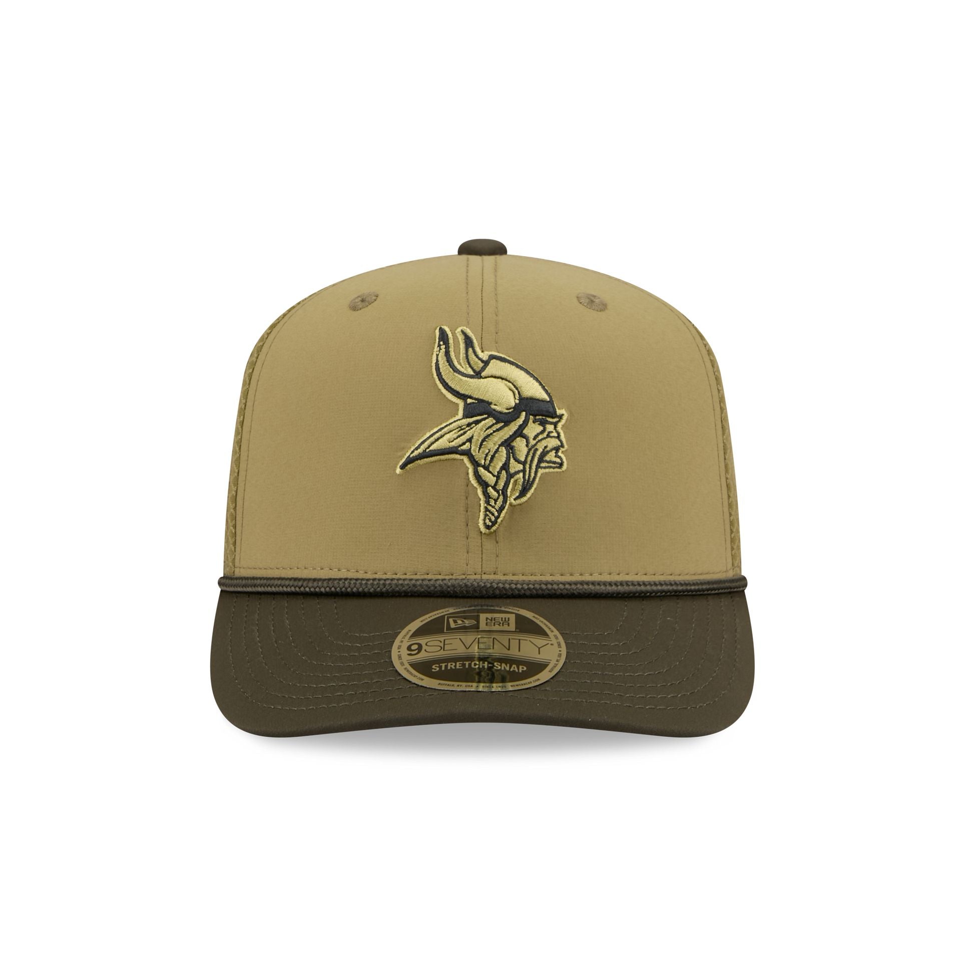 The Minnesota Vikings 2025 Salute to Service 9SEVENTY Trucker features an embroidered Vikings logo at the front panels with the official NFL Salute to Service patch above a snapback closure at the rear. Additional details include an American flag patch at the right-wear side with a silicone team logo patch at a dark green undervisor and a digi camo interior fabrication.