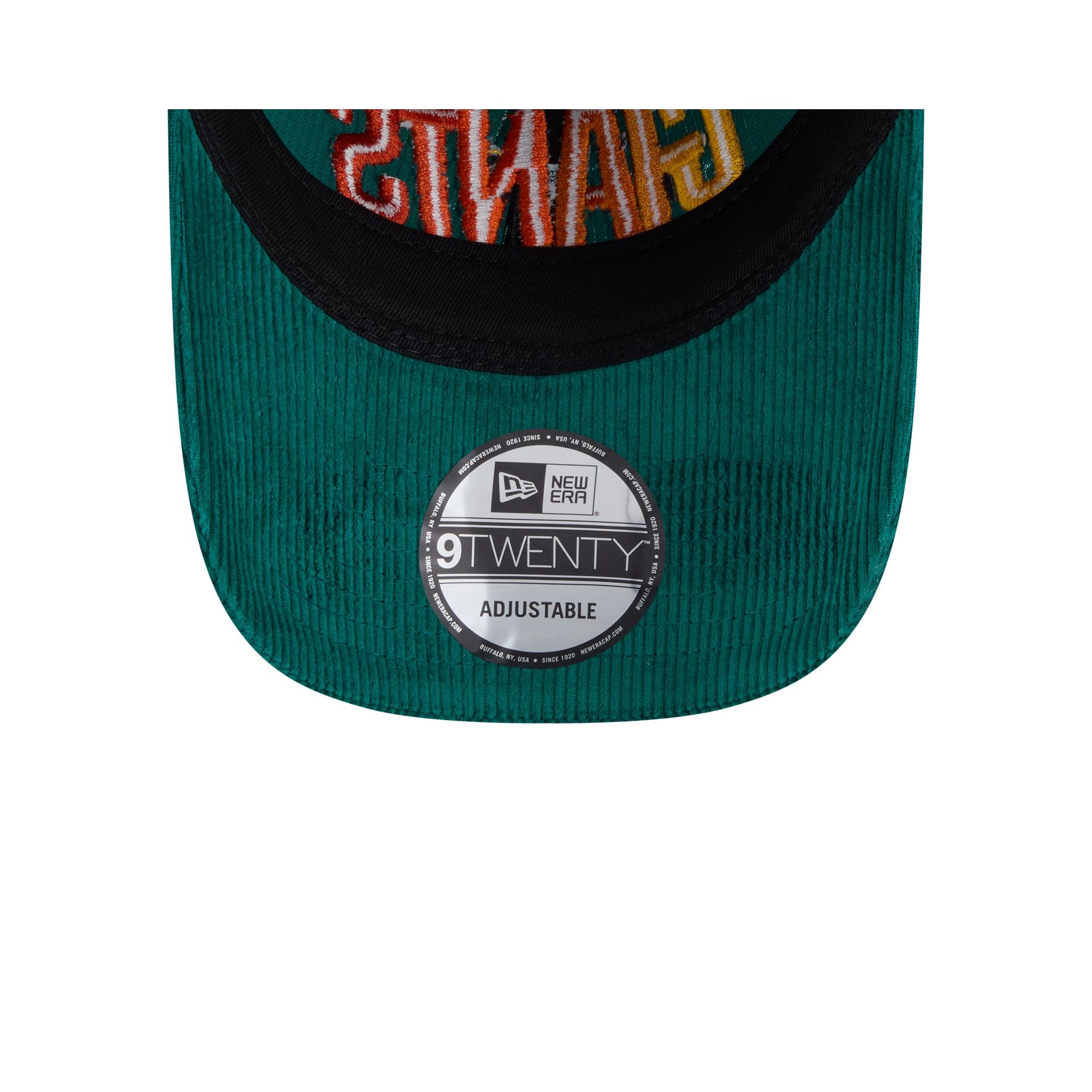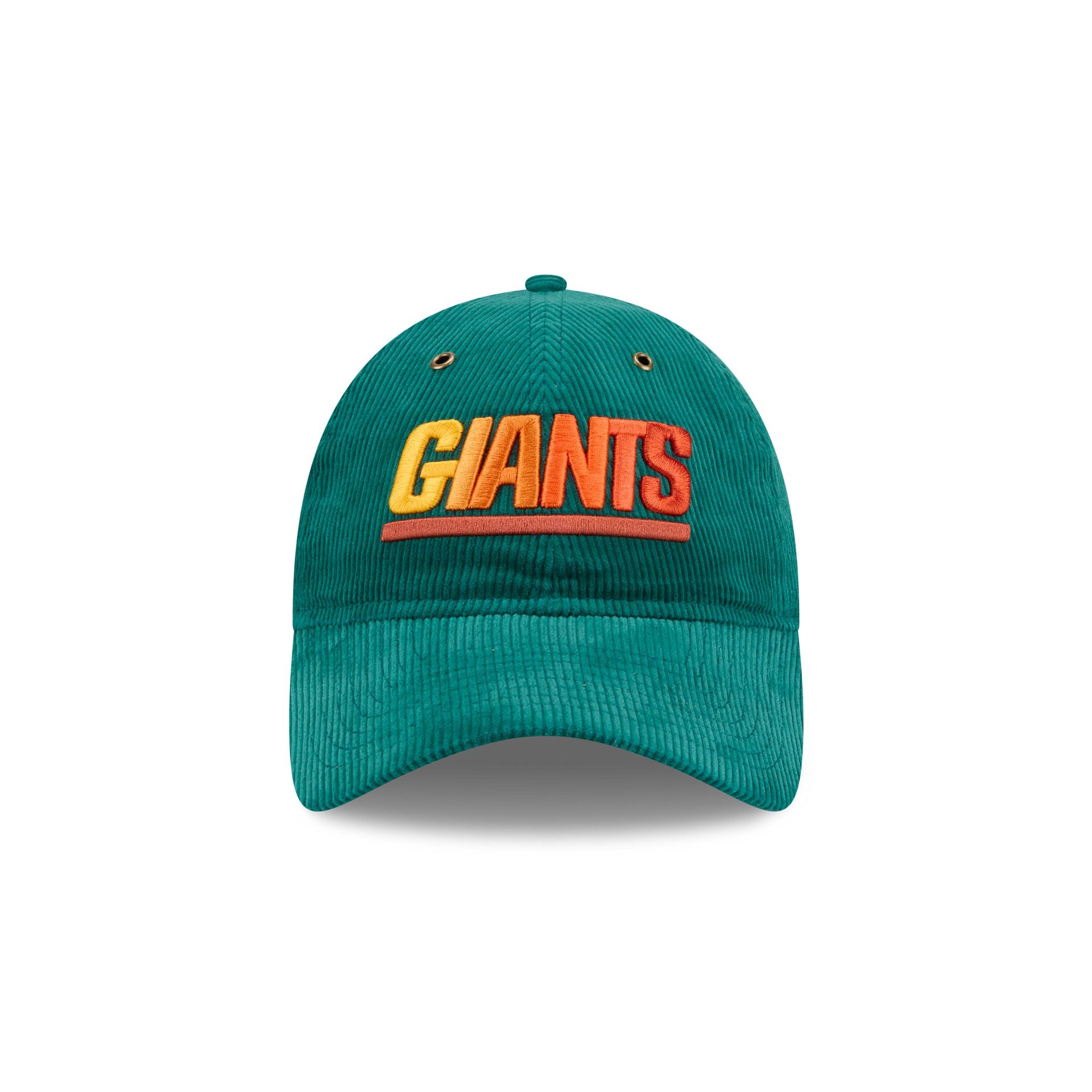 The New York Giants Gradient Corduroy 9TWENTY Adjustable Cap features an embroidered Giants gradient wordmark at the front panels against a green corduroy fabrication. Additional details include eyelets at the crown and an adjustable clasp closure at the rear.