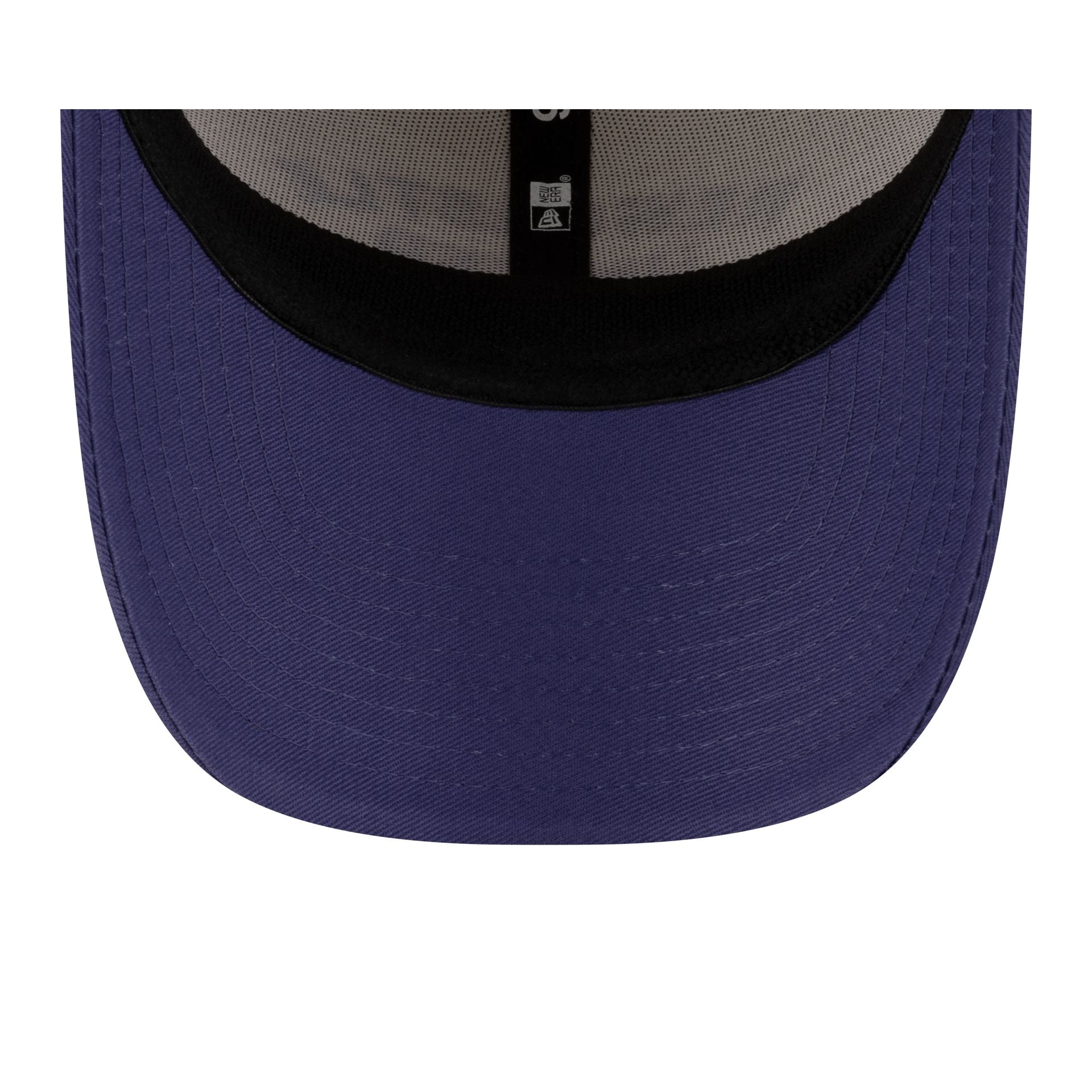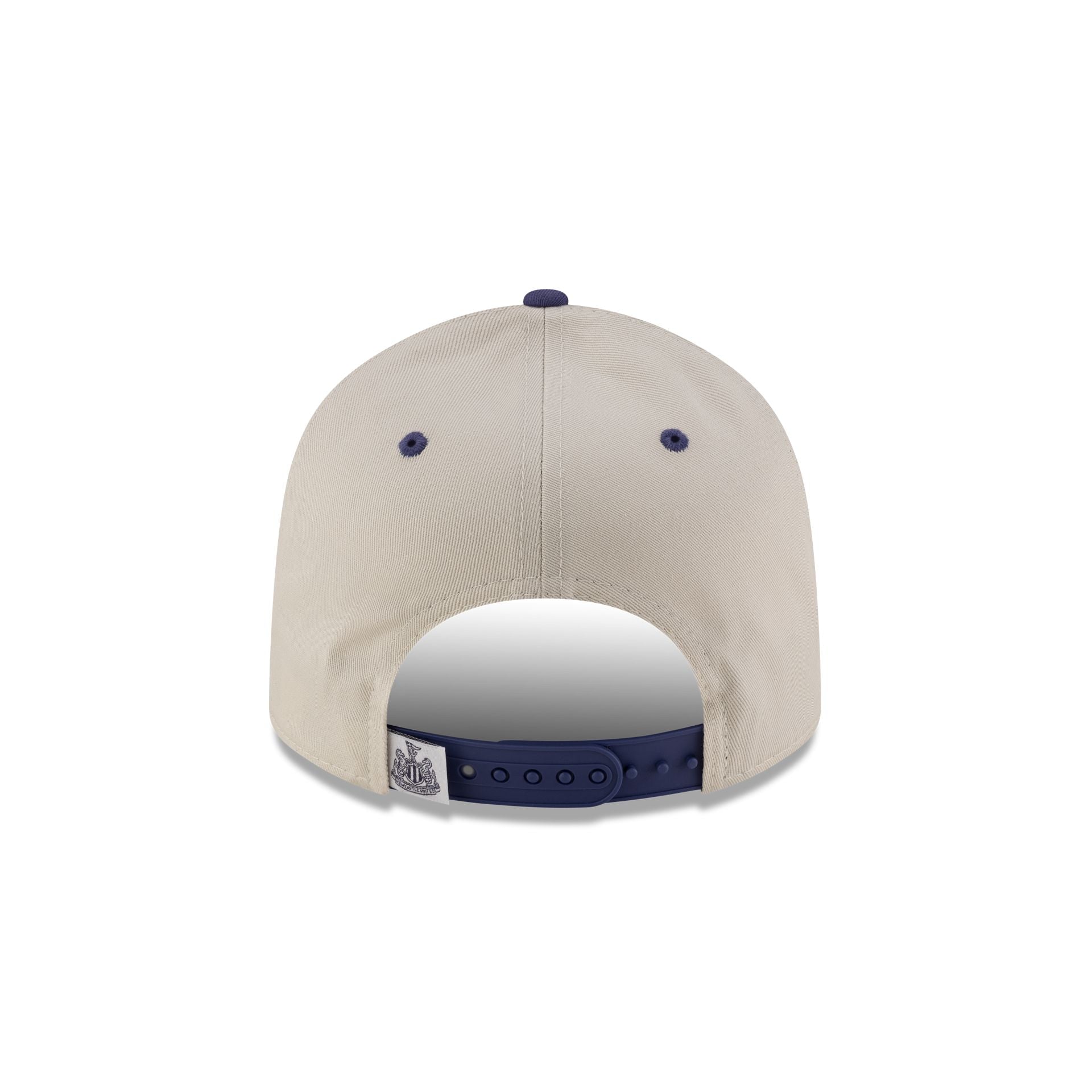 The Newcastle United FC Ivory 9FIFTY Stretch-Snap Cap features an embroidered Newcastle wordmark at the front panels with a purple visor and a woven team logo tag at an adjustable snapback closure at the rear.