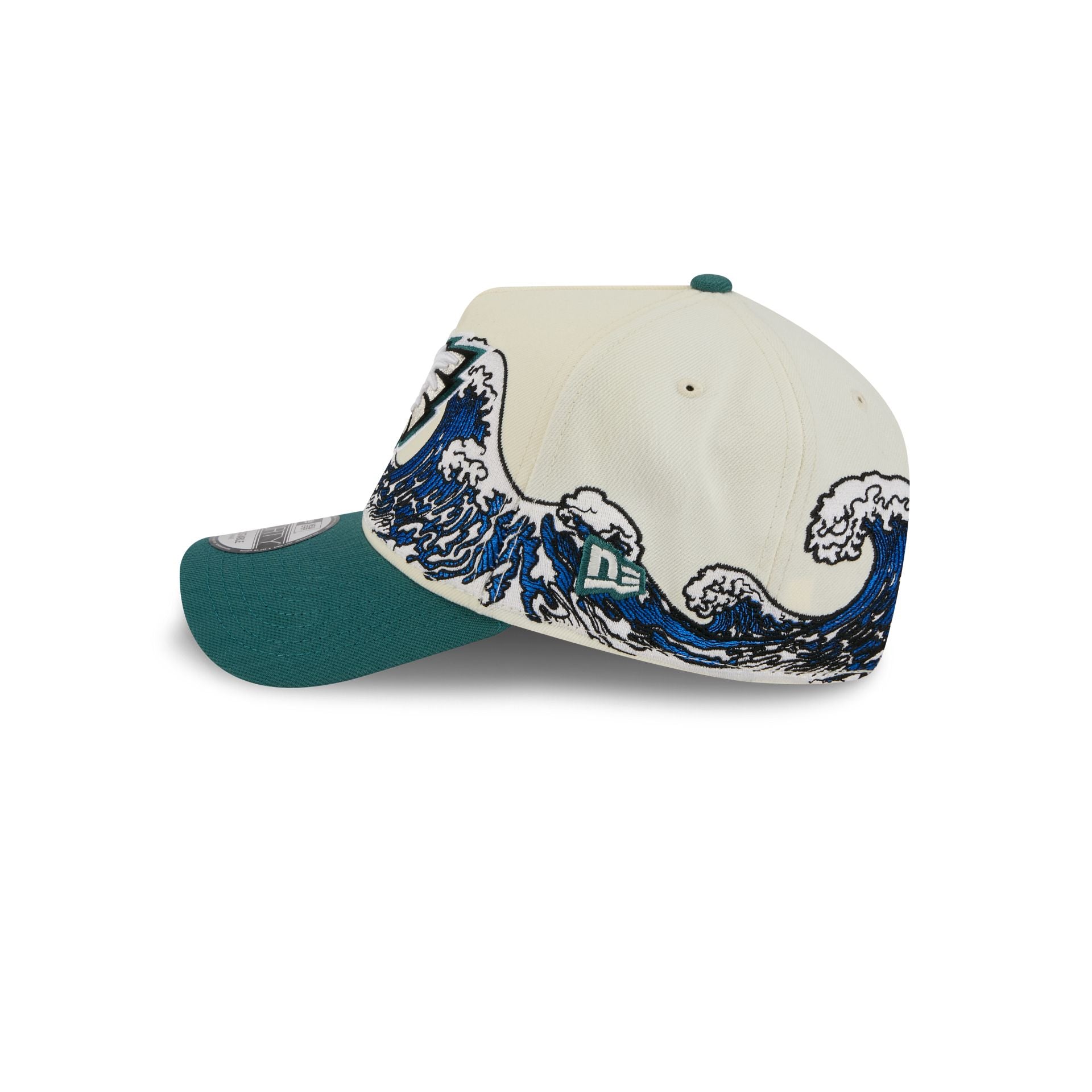 The Philadelphia Eagles Tidal Flow 9FORTY A-Frame Snapback features an embroidered Eagles logo at the front panels with tidal waves throughout the cap. Additional details include an adjustable snapback closure at the rear and a gray undervisor.