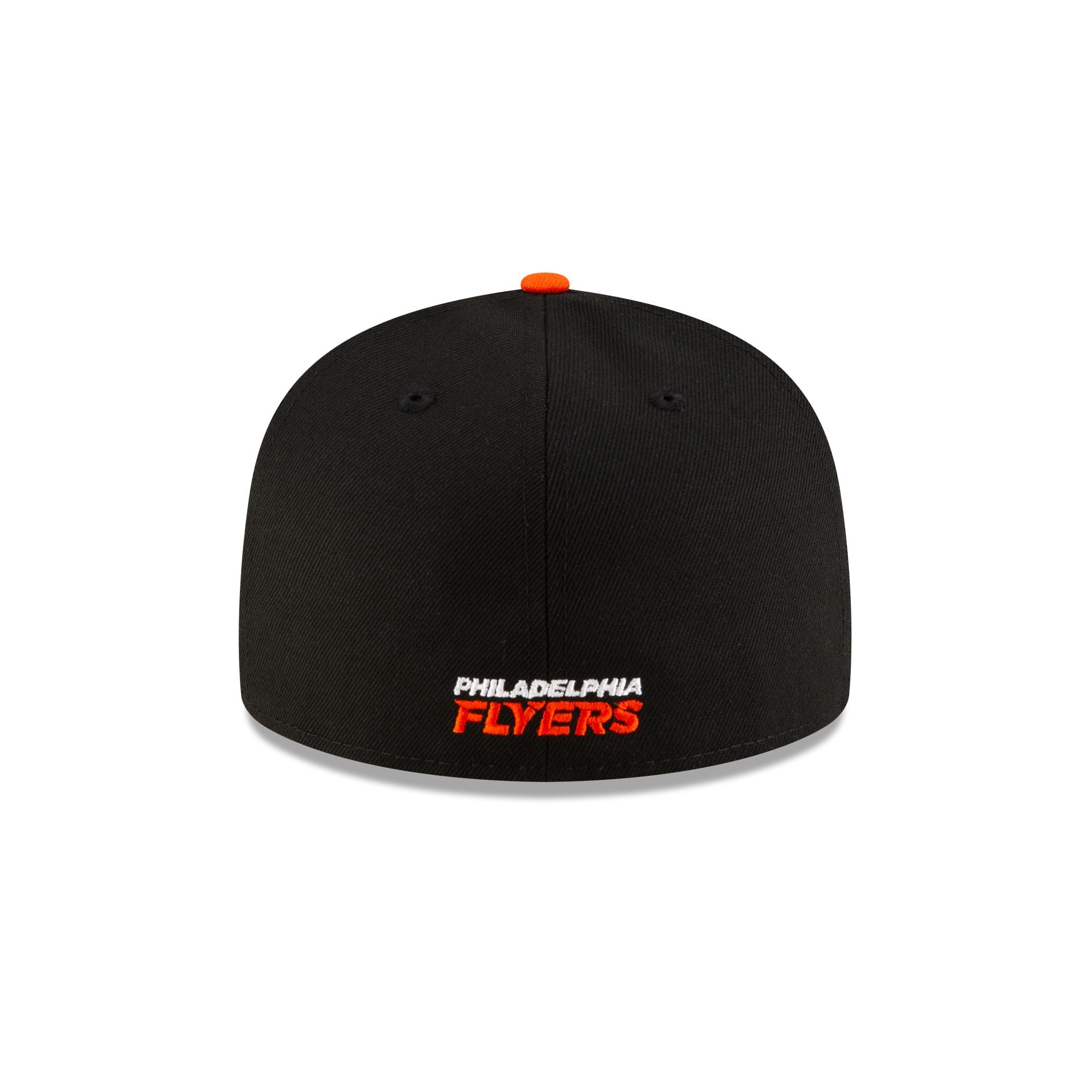 The Philadelphia Flyers Black 59FIFTY Fitted Cap features an embroidered Flyers logo at the front panels with a matching wordmark at the rear, an orange visor, and a gray undervisor.