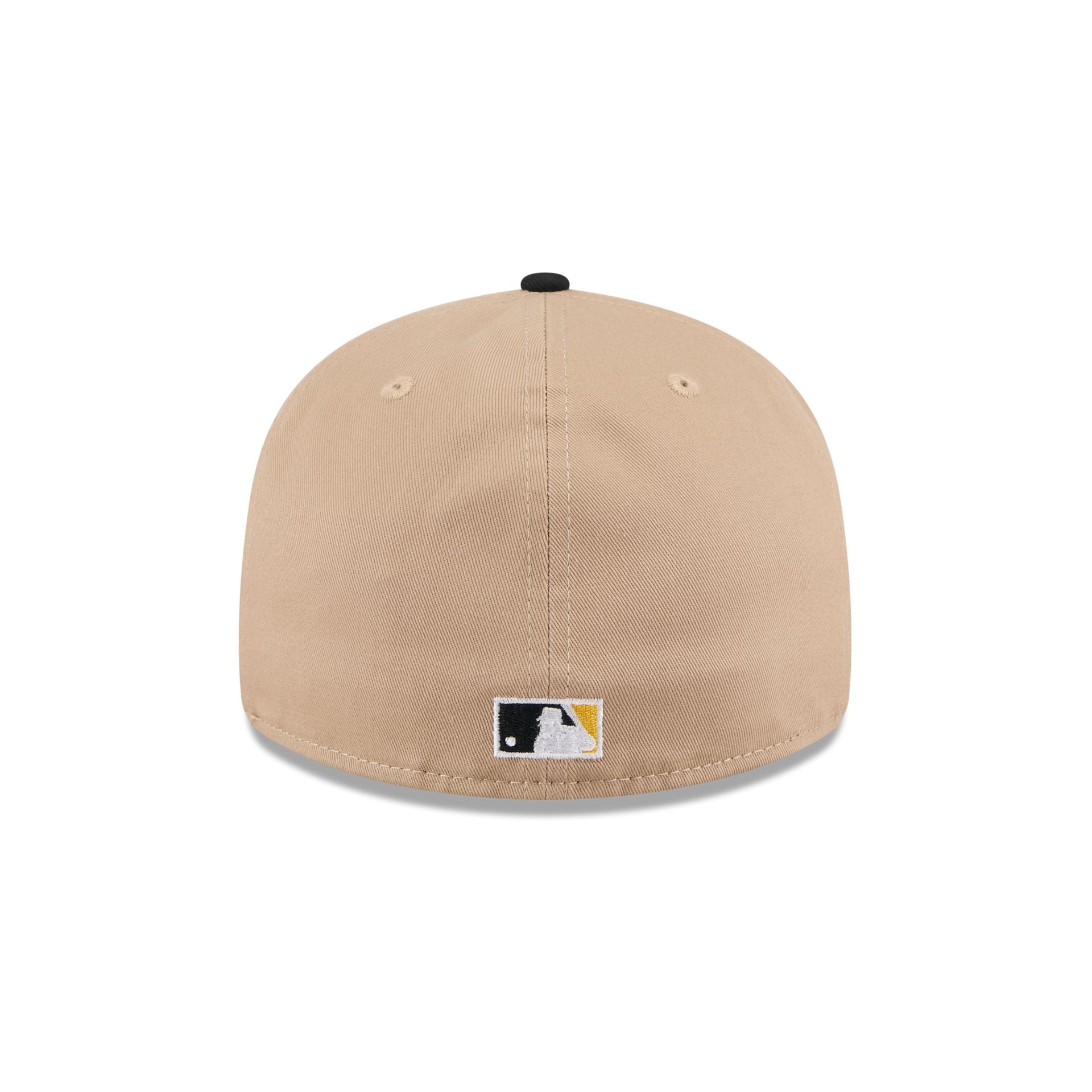 The Pittsburgh Pirates Camel Retro Crown 59FIFTY Fitted Cap features an embroidered Pirates Cooperstown wordmark, logo, and league patch at the front panels. Additional details include an MLB Batterman logo at the rear and a gray undervisor.