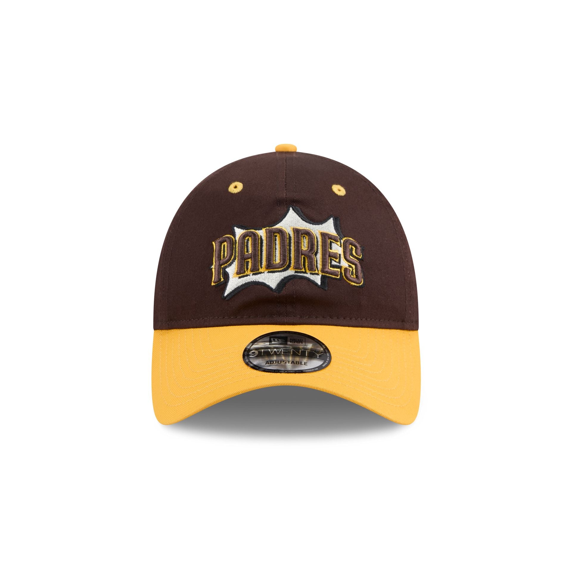 The San Diego Padres Diamond Hero Edition 9TWENTY Adjustable Cap features an embroidered Padres onomatopoeia pop wordmark at the front panels with a ZOOM! wordmark at the left-wear side. Additional details include the MLB Batterman logo above an adjustable D-Ring closure at the rear and a baseball comic undervisor.