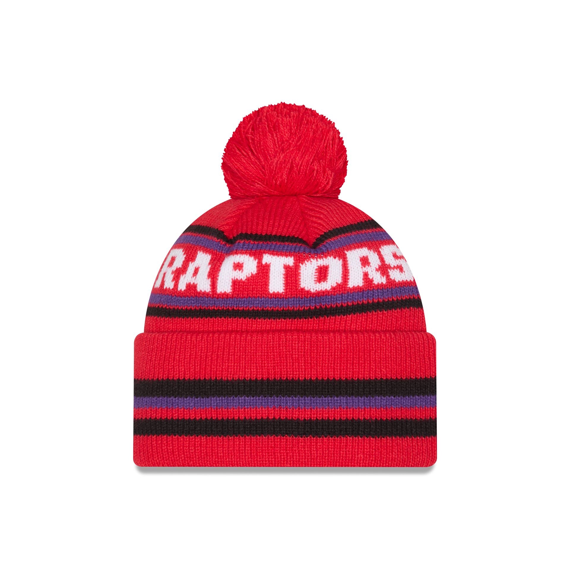 The Toronto Raptors Classic Pom Knit Hat features an embroidered Raptors logo at the front cuff with a wordmark at the crown and a one-time removable pom.